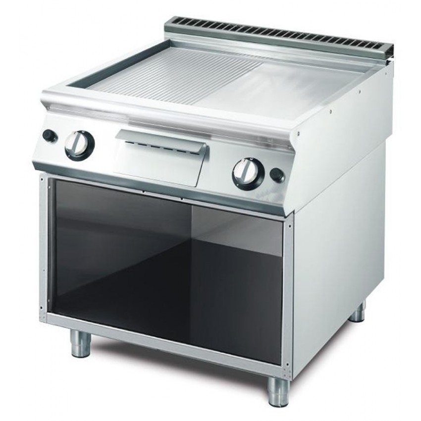 Las cocinas de restaurantes, hoteles y colectividades suelen poner fry-top, son planchas que tienen mucha más potencia. Además cuentan con un grosor de placa de casi un centímetro, el reparto del calor es más homogéneo, y consumen menos. Tienes la opción de instalarla con muebles que, pueden ir con puertas, con estantes y así pueden guardarse las ollas o sartenes.